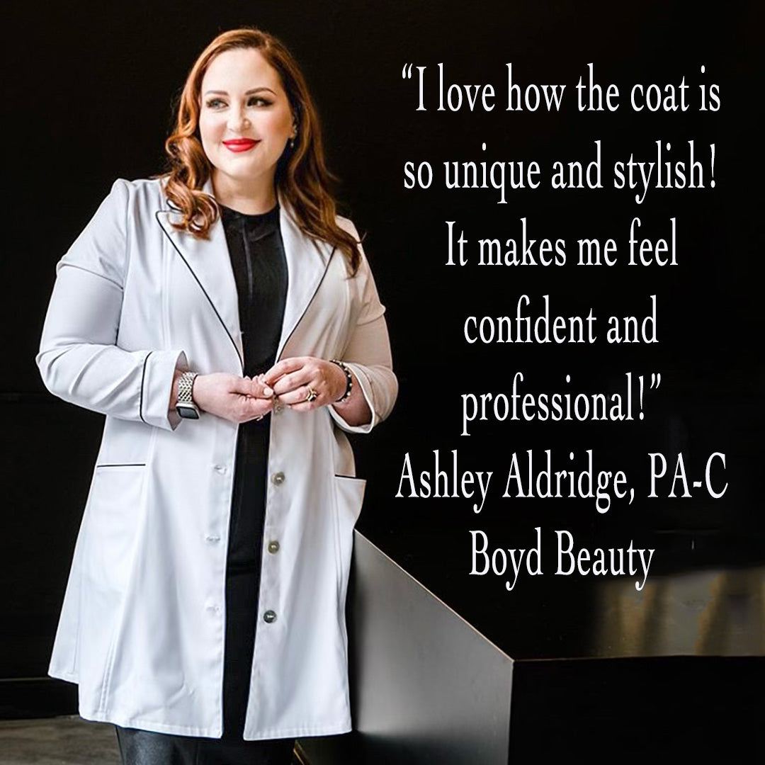 I find myself teaching in about 200 different offices a year, as the number one educator for the largest aesthetic pharmaceutical company in America. I am hired for business consulting as well as aesthetic injectable training. One thing I observe consistently is the lack of credentialing or titles embroidered on scrubs, and definitely an absence of lab coats. In my observation, less than 1% of aesthetic providers wear lab coats routinely. These same offices confide in me that they feel their patients don’t respect their medical judgement. Their dosing recommendations aren’t being taken seriously. They also struggle with confidence during these patient encounters. Meanwhile, they are dressed in unmarked scrubs, or street clothes which reflects exactly what the receptionist, or medical assistant is wearing. When asked why they don’t “level up” their credentials with a lab coat, they communicate to me that they have tried to wear a lab coat, but the coats are “too hot,” “too stiff,” or “not figure flattering.”
